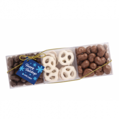 Get more clients to see what your brand brings to the table when you give out this 3 way square acetate container filled with assorted chocolate confections!This is a great item for holiday specials. Make a big impact on your customers with a great item like this!