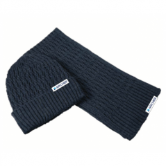 100% Acrylic 8.5” x 64” Scarf and matching 9” Beanie feature an ultra soft ribbed knit, packaged in a clear vinyl gift bag. Stretch fabric for a one size fits most Beanie.